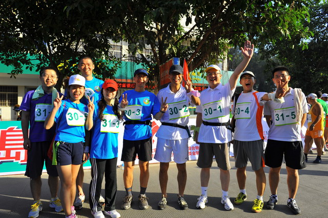 11月5日,秋陽燦爛,大家早已躍躍欲試,隊(duì)中負(fù)責(zé)后勤的我,早在比賽前夕就廣發(fā)注意帖:速干短褲、帽子、腰包、水杯、小方巾、鞋子等物品需必備;作為隊(duì)伍領(lǐng)頭雁的齊總則早已咨詢專業(yè)選手,提倡大家結(jié)合自己體力準(zhǔn)備能量棒、巧克力等緊急能量品;隊(duì)長鄧總在了解路線和路況后,制定了“穩(wěn)重取勝”的戰(zhàn)略,采取了“準(zhǔn)備活動做充足,先慢后快求適應(yīng),不因外因亂陣腳,敵疲我追求成績”的具體戰(zhàn)術(shù);隊(duì)伍中的另一名隊(duì)員則帶來了他專業(yè)的GPS定位手表,分時(shí)段匯報(bào)所走路程、當(dāng)前速度適當(dāng)與否,并提前告知提速準(zhǔn)備;我們的女隊(duì)友亞梅,則一路保持微笑,緊跟隊(duì)伍,偶爾爆出的一些冷笑話,讓緊張趕路的我們倍感清爽。